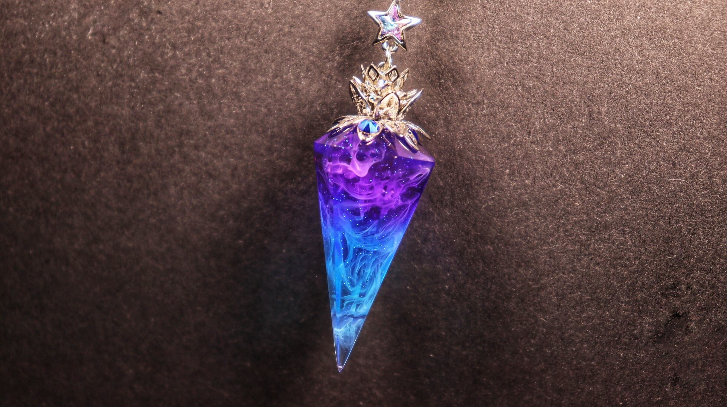 クリアな透明感と美しいパープル×ブルーのグラデーションが魅力のレジンペンデュラム。パウダー青の輝きと磨かれた仕上げによって、光が透過し、輝きを放ちます。使い道は様々で、単なるインテリアとしてだけでなく、エネルギーの伝達や占いグッズとしても使えます。手作りのため、一つ一つの色やデザインが異なるため、それぞれがオリジナルの魅力を持ちます。あなただけの特別なペンデュラムを手に入れて、大切な人生の選択や決断のサポートをしてみませんか?