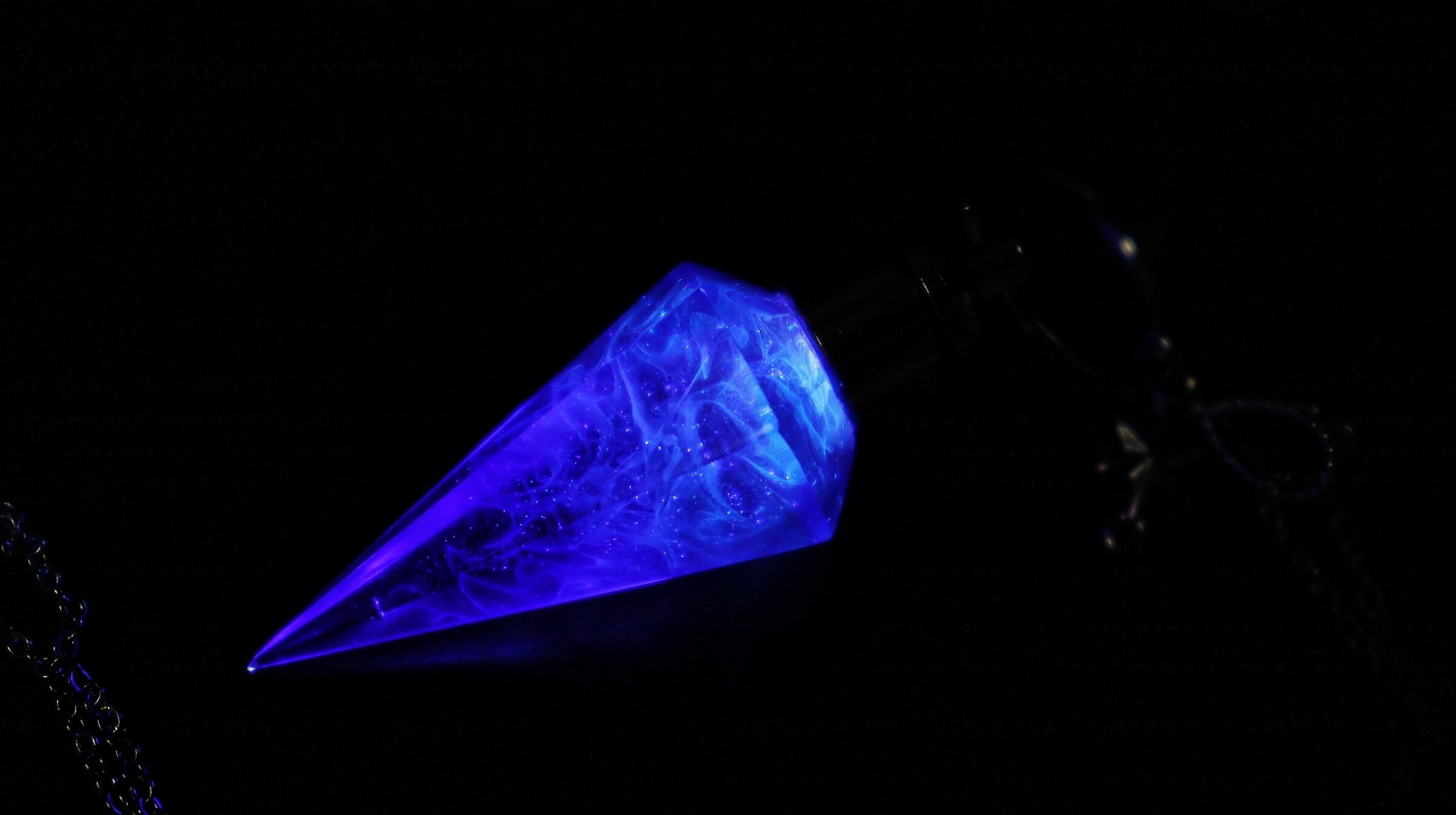 クリアな透明感と美しいパープル×ブルーのグラデーションが魅力のレジンペンデュラム。パウダー青の輝きと磨かれた仕上げによって、光が透過し、輝きを放ちます。使い道は様々で、単なるインテリアとしてだけでなく、エネルギーの伝達や占いグッズとしても使えます。手作りのため、一つ一つの色やデザインが異なるため、それぞれがオリジナルの魅力を持ちます。あなただけの特別なペンデュラムを手に入れて、大切な人生の選択や決断のサポートをしてみませんか?