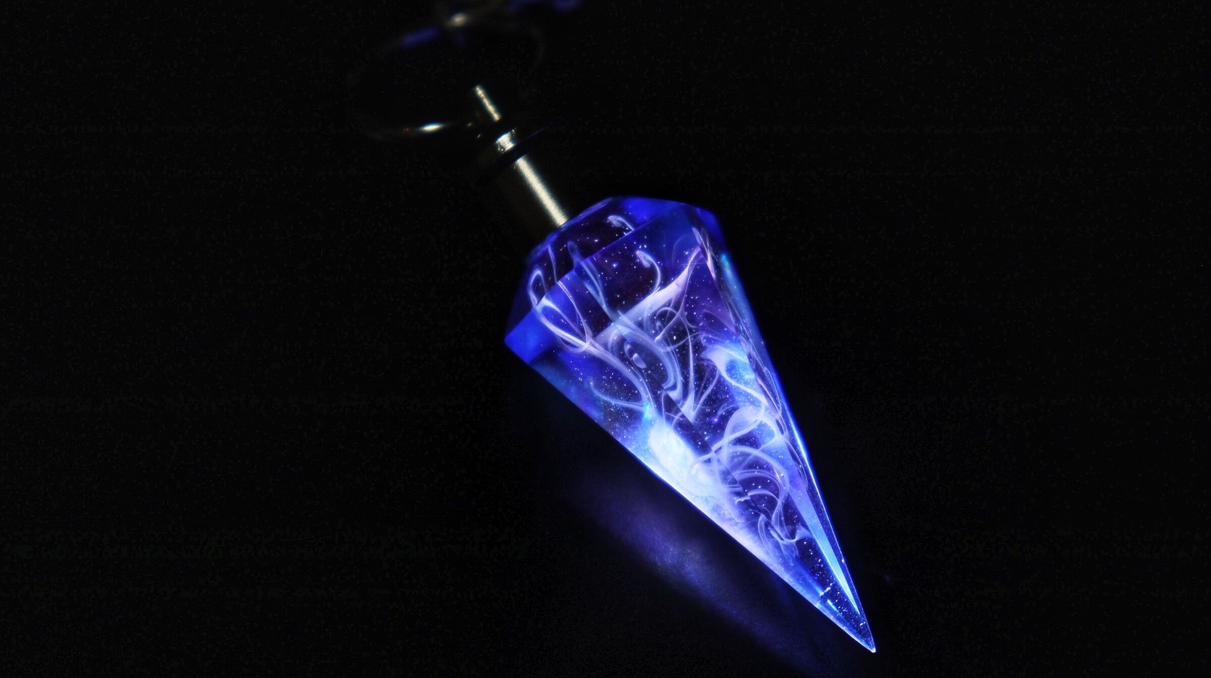 クリアな透明感と美しいパープル×ブルーのグラデーションが魅力のレジンペンデュラム。パウダー青の輝きと磨かれた仕上げによって、光が透過し、輝きを放ちます。使い道は様々で、単なるインテリアとしてだけでなく、エネルギーの伝達や占いグッズとしても使えます。手作りのため、一つ一つの色やデザインが異なるため、それぞれがオリジナルの魅力を持ちます。あなただけの特別なペンデュラムを手に入れて、大切な人生の選択や決断のサポートをしてみませんか?