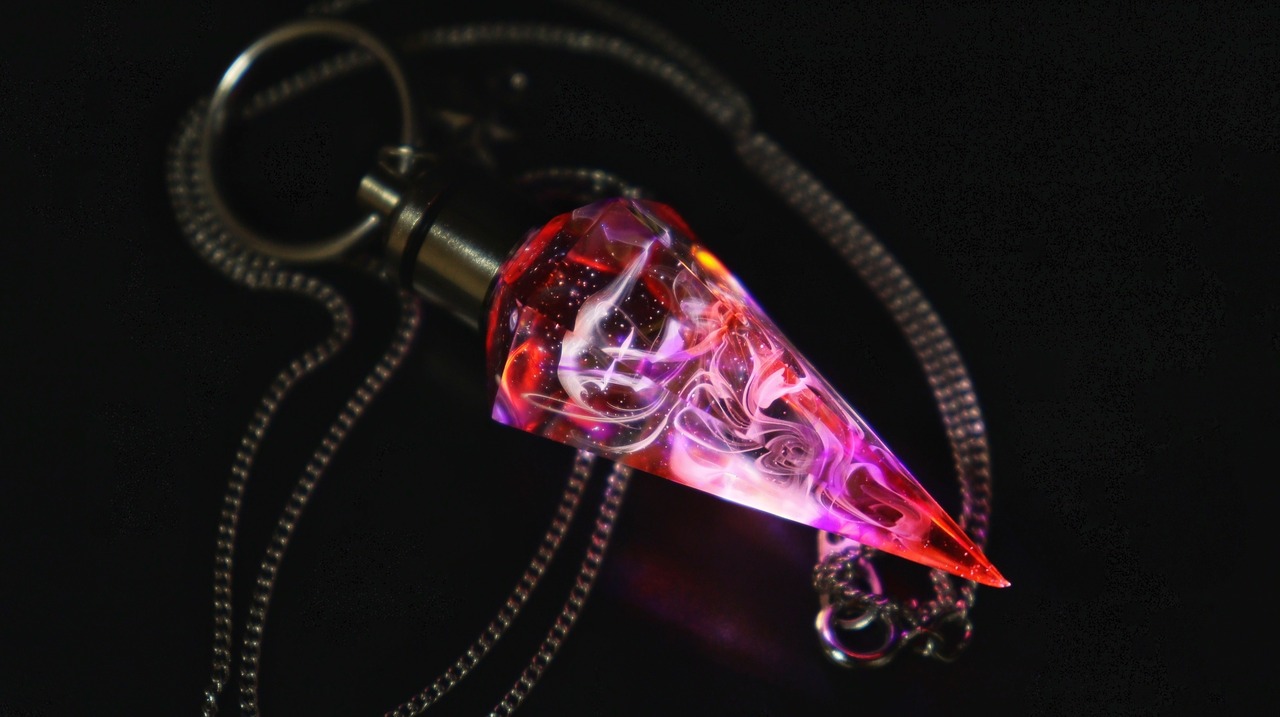 クリアな透明感と美しいパープル×ブルーのグラデーションが魅力のレジンペンデュラム。パウダー青の輝きと磨かれた仕上げによって、光が透過し、輝きを放ちます。使い道は様々で、単なるインテリアとしてだけでなく、エネルギーの伝達や占いグッズとしても使えます。手作りのため、一つ一つの色やデザインが異なるため、それぞれがオリジナルの魅力を持ちます。あなただけの特別なペンデュラムを手に入れて、大切な人生の選択や決断のサポートをしてみませんか?