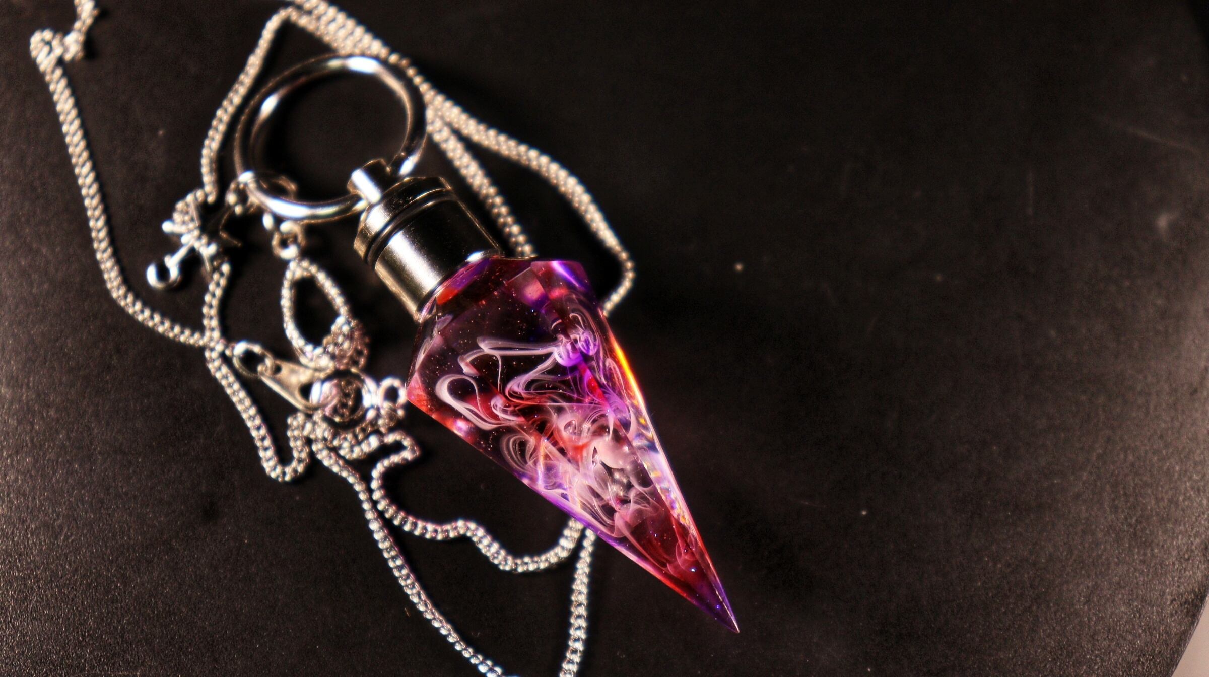 クリアな透明感と美しいパープル×ブルーのグラデーションが魅力のレジンペンデュラム。パウダー青の輝きと磨かれた仕上げによって、光が透過し、輝きを放ちます。使い道は様々で、単なるインテリアとしてだけでなく、エネルギーの伝達や占いグッズとしても使えます。手作りのため、一つ一つの色やデザインが異なるため、それぞれがオリジナルの魅力を持ちます。あなただけの特別なペンデュラムを手に入れて、大切な人生の選択や決断のサポートをしてみませんか?